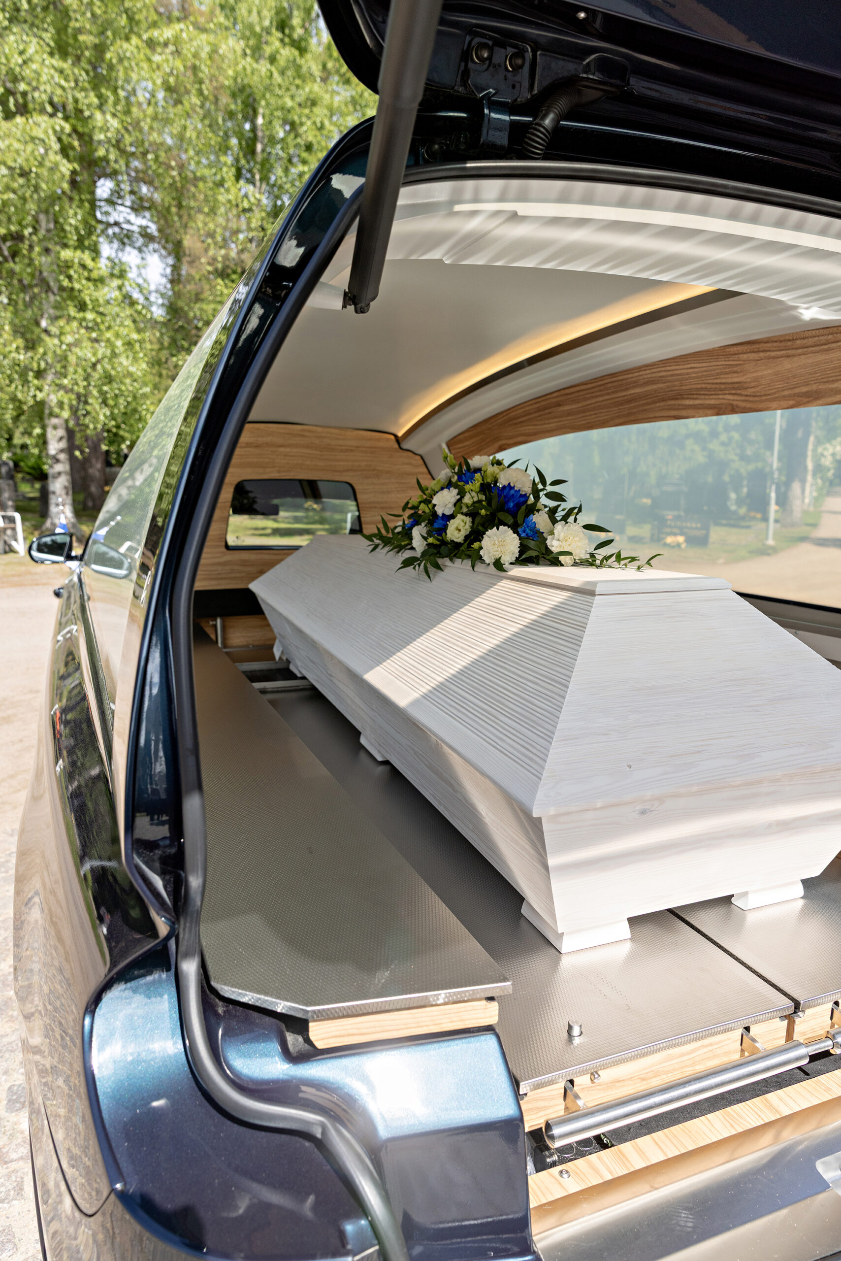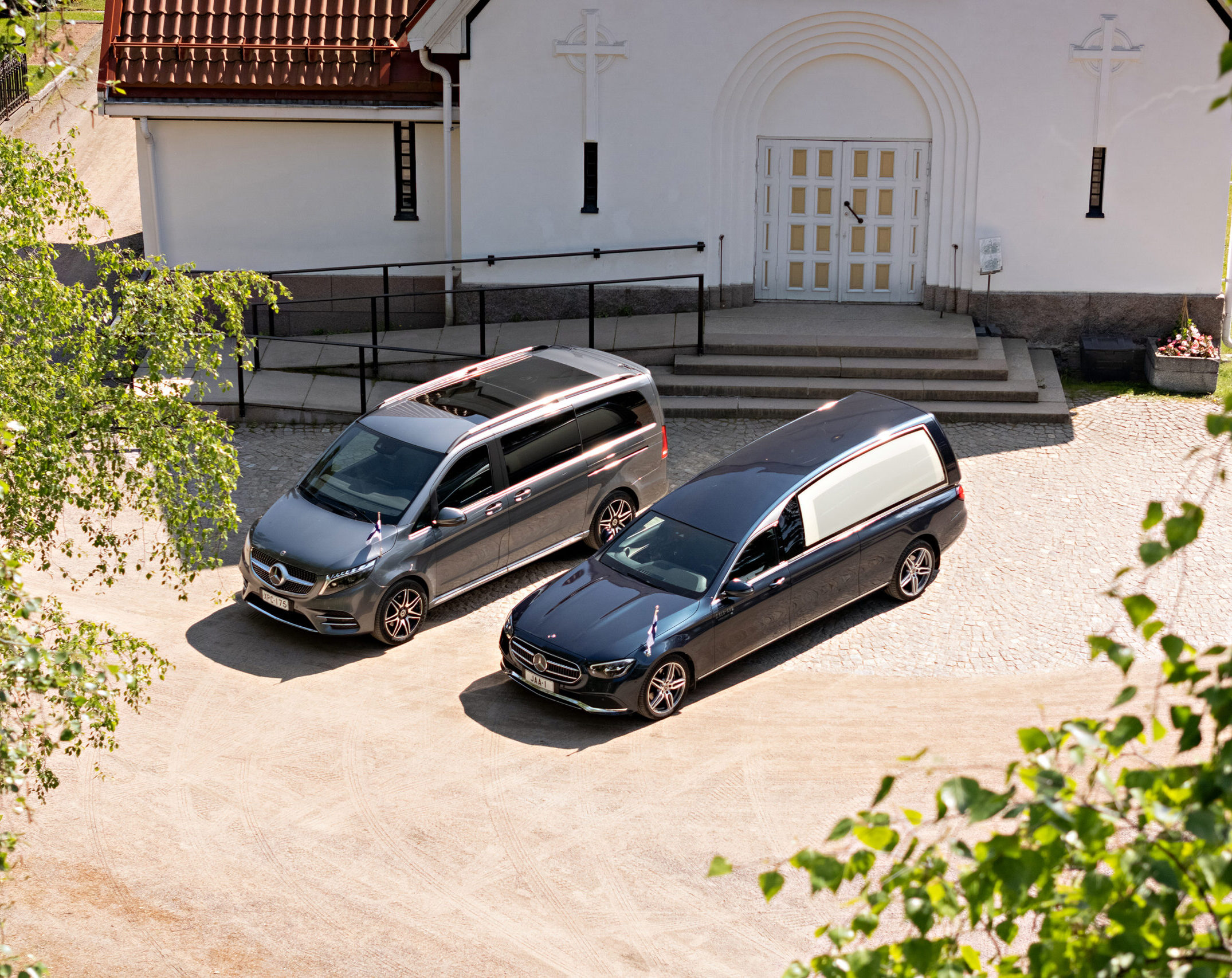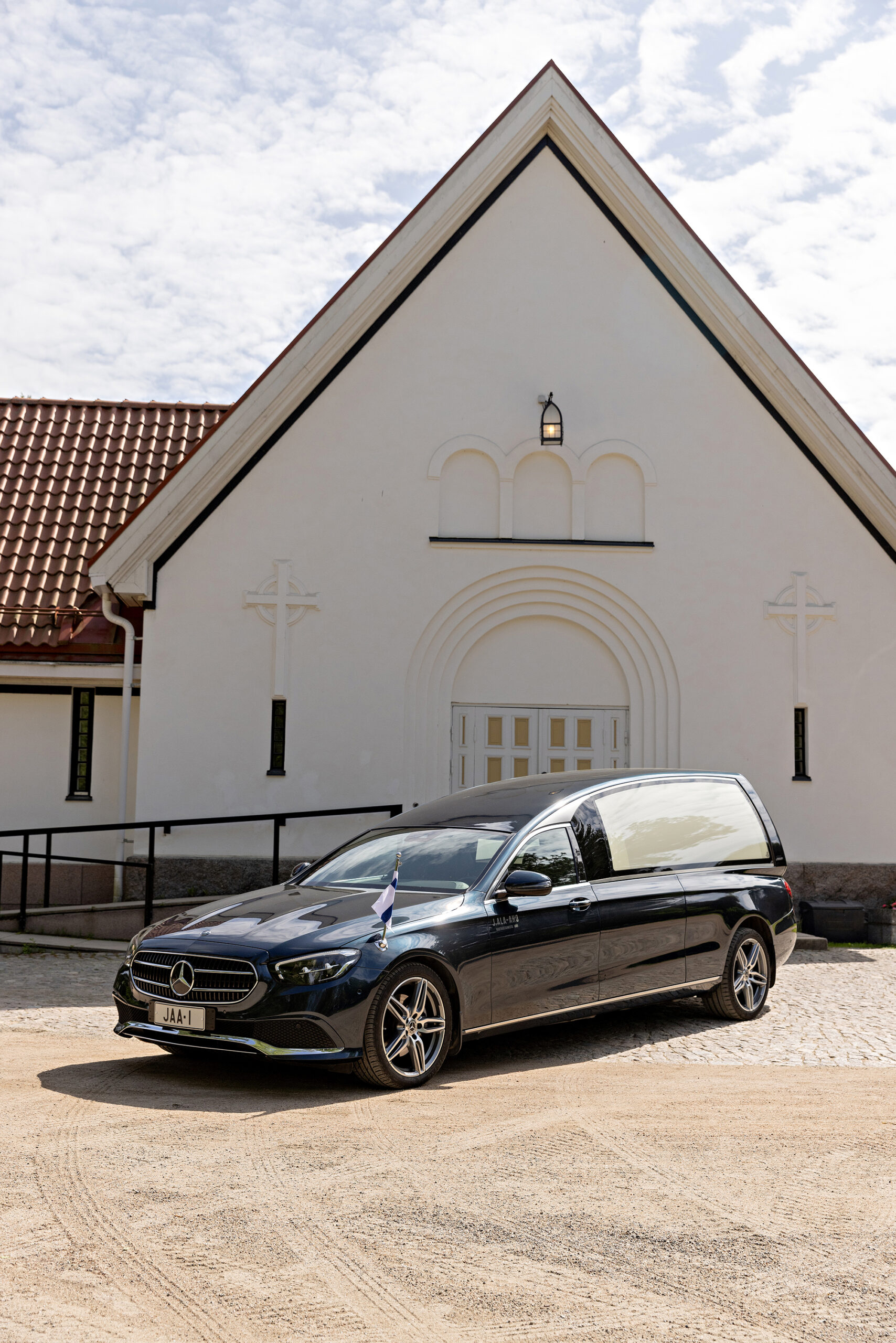 Hoidamme kaikki alan kuljetukset edustavilla, nykyaikaisilla, vähäpäästöisillä ja hautauskäyttöön valmistetuilla Mercedes-Benz-hautausautoilla.
